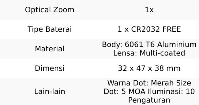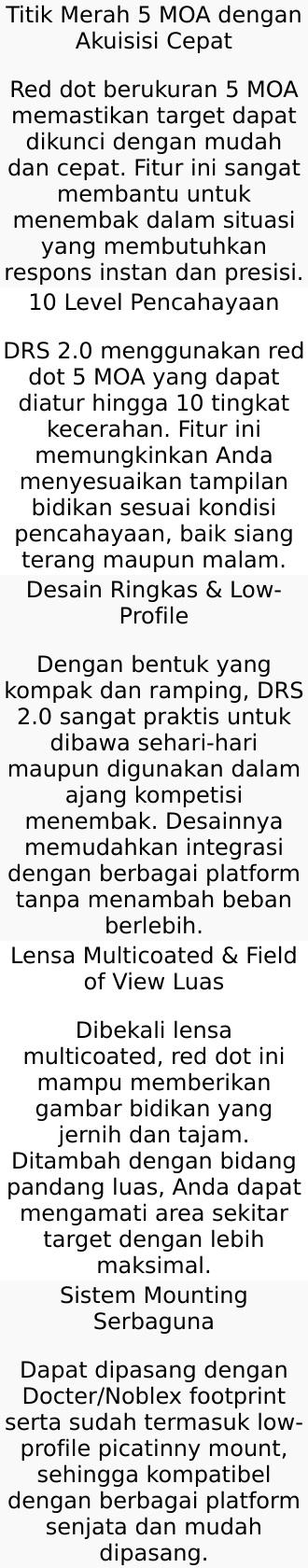 U.S. Optics DRS 2.0 hadir dengan pembesaran sejati 1x dan titik merah 5 MOA yang memudahkan akuisisi target secara cepat dan akurat. Dirancang khusus untuk kebutuhan taktis, alat bidik ini menawarkan performa tinggi dengan berbagai pengaturan pencahayaan yang fleksibel.